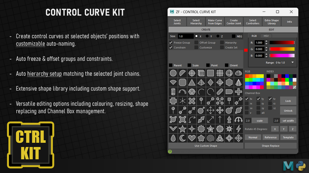 A versatile and artist-friendly Maya rigging tool for creating and editing control curves, which includes automatic naming, group creation, hierarchy setup and constraining.